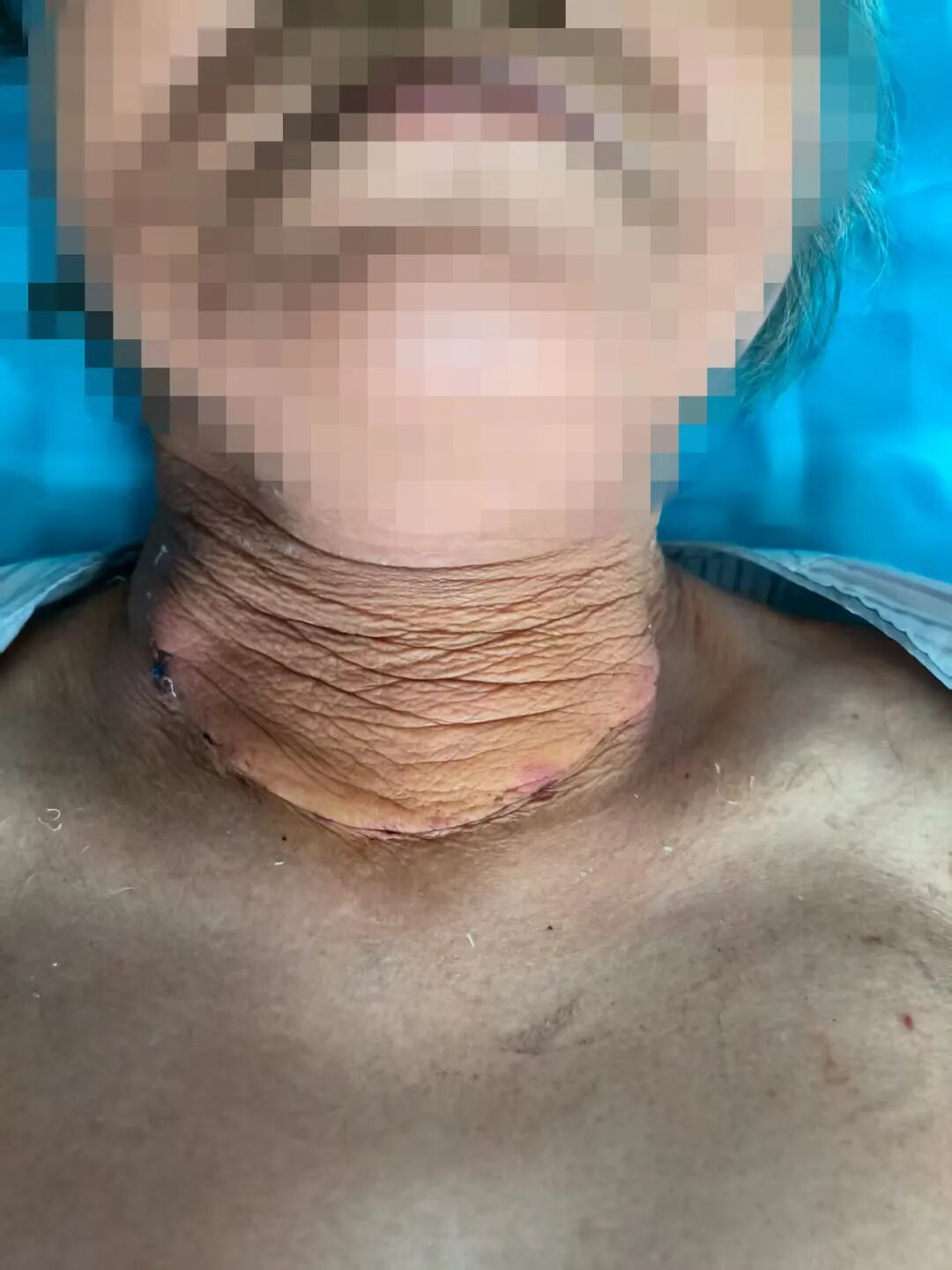 76岁患者李奶奶因颈前肿物明显增大至我院就诊,由杨四清副主任医师接诊。查体发现颈前肿物巨大,经甲状腺彩超及颈部CT检查,提示双侧甲状腺弥漫性显著增大,左侧叶最大直径达9.4cm,右侧叶最大直径7cm,纤维喉镜显示咽腔狭窄,手术难度和风险高。患者76岁高龄,既往合并甲亢性心脏病、慢性心功能不全、心房颤动及心脏瓣膜病等多种严重基础疾病,术前联合麻醉科、心血管内科等多学科讨论后,决定实施甲状腺切除术。针对患者存在气管受压狭窄及气管软化等困难气道情况,麻醉科凭借丰富经验,在患者清醒状态下成功实施电子支气管镜引导下的清醒气管插管,之后顺利转为全身麻醉。在麻醉科协助下,我科顺利完成巨大甲状腺切除手术,术中严格保护周围重要神经和器官。因患者基础疾病严重,直接拔管存在气管塌陷风险,术后带气管插管转入ICU监护,待病情稳定、顺利拔管后转回我科普通病房继续治疗。术后一周患者恢复良好,语言及进食功能正常,现已康复出院。