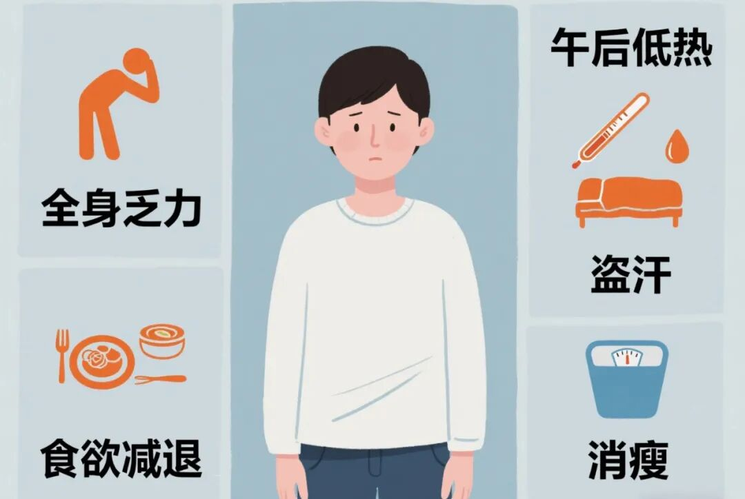 1.全身中毒症状。全身乏力,食欲减退、午后低热、盗汗和消瘦。