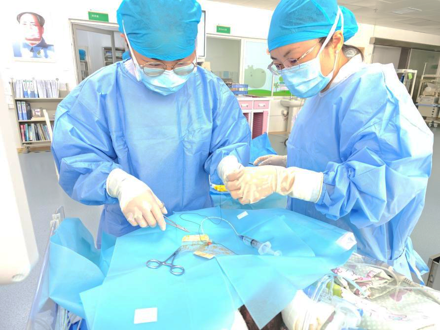 ▲赖颖瑜医生(右一)和同事为早产儿宝宝行脐动静脉穿刺术