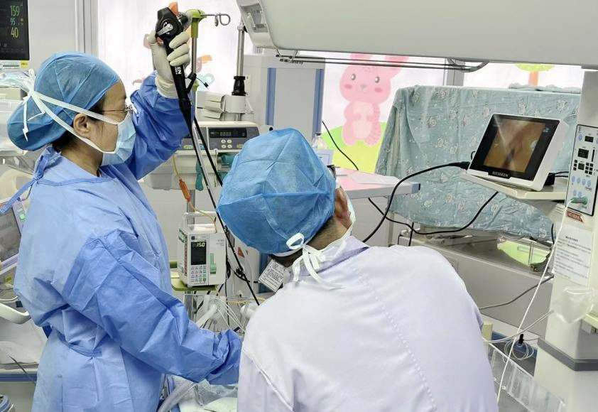 ▲赖颖瑜医生和同事为患儿行支气管镜检查
