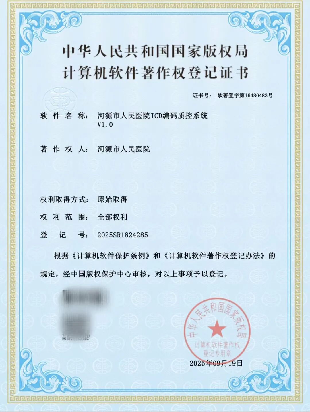近日,从国家版权局传来振奋人心的喜讯,我院病案统计科陈伟达开发团队自主开发的"ICD查询字典软件"与"ICD编码质控系统"双双获得中华人民共和国国家版权局颁发的《计算机软件著作权登记证书》。这不仅是对我院科研创新能力的国家级权威认可,更实现了河源地区医疗行业内此类专业软件著作权"零的突破",标志着我院病案管理信息化、智能化水平迈上了全新台阶。