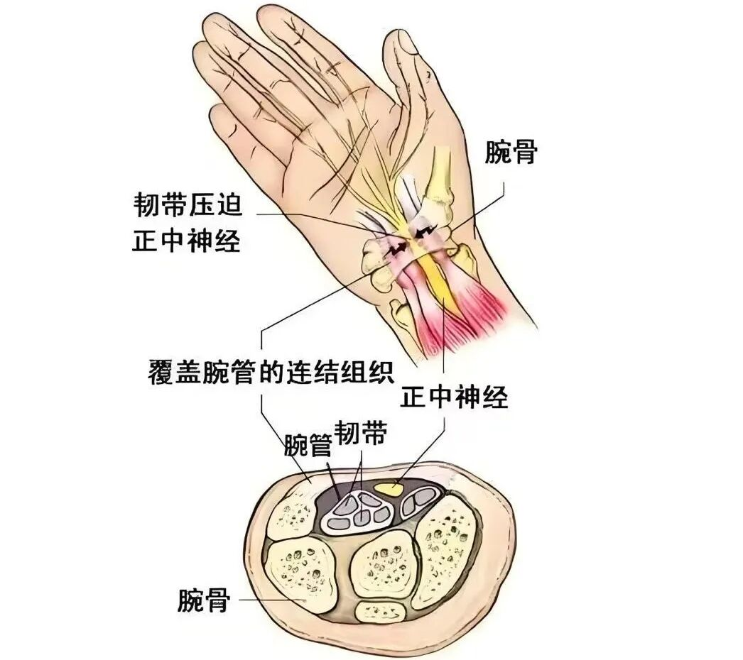 腕管综合征(CTS)是最常见的周围神经压迫性疾病。我们每个人的手腕中,都藏着一个叫“腕管”的狭窄通道,像一条小隧道,一侧是坚硬的腕骨,另一侧是坚韧的横韧带。里面密密麻麻地挤着9条控制手指活动的肌腱,还有一根关键的“正中神经”,它负责我们的手指感觉和部分运动。当这个通道内压力升高,比如长时间弯曲手腕、组织水肿或外伤,就像把水管压扁了一样,正中神经被“卡”住了,神经信号传输受阻,手指就会出现麻木、刺痛、无力等问题。这也是它被称为“鼠标手”的原因之一:长时间握鼠标、打字等重复动作,正是诱发腕管综合征的“元凶”。