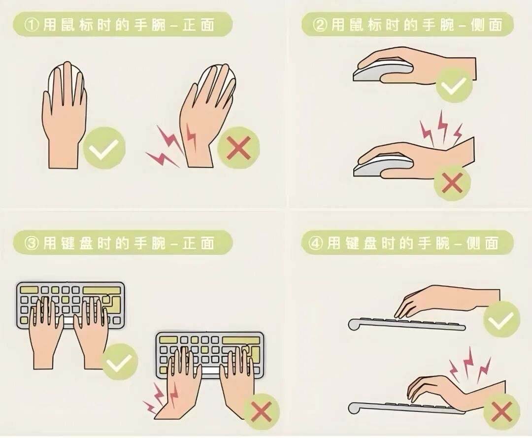 1.保持正确姿势:打字、使用鼠标时,手腕尽量与地面平行,不要过度弯曲或上翘。键盘鼠标应与肘部高度持平,避免手腕悬空。