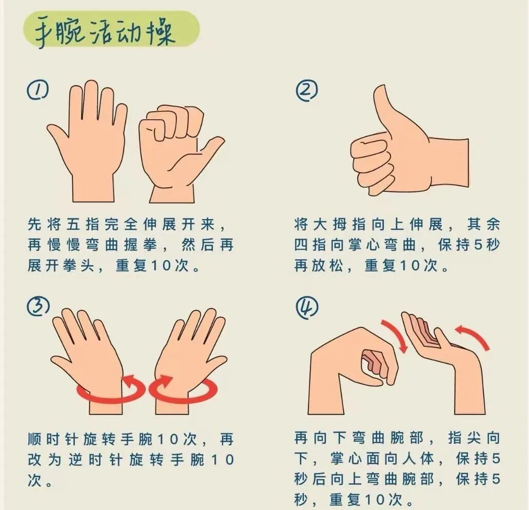 4.简单拉伸练习:例如“手腕拉伸操”:一只手臂伸直,掌心向下,用另一只手轻轻将手指向身体方向掰动,保持15秒。左右各做3次,简单易行又有效。