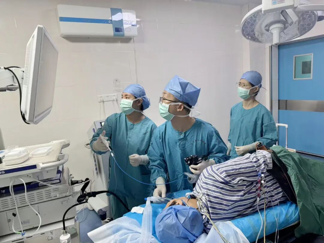 ▲我院省医派驻专家、消化内科副主任郑中文(中)在龙川县人民医院消化内科开展胃多发息肉及食管粘膜下肿物ESD切除术