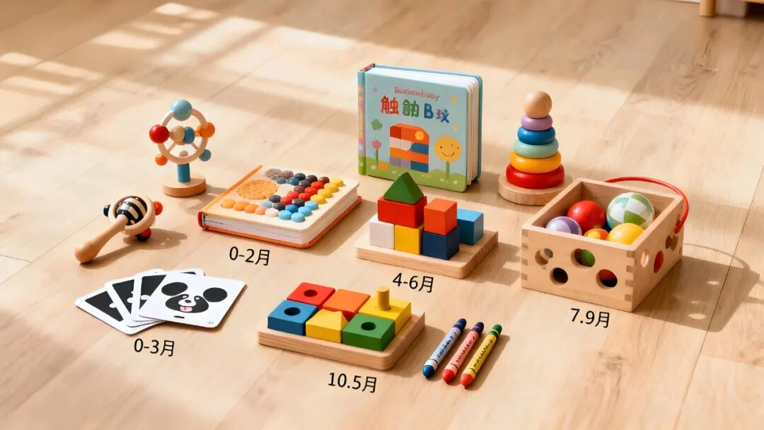 1.玩具选择:按阶段提供适龄玩具,如摇铃、黑白卡(0-3月);触觉书、软积木(4-6月);叠叠乐、投球盒(7-9月);拼插积木、涂鸦蜡笔(10-12月)。