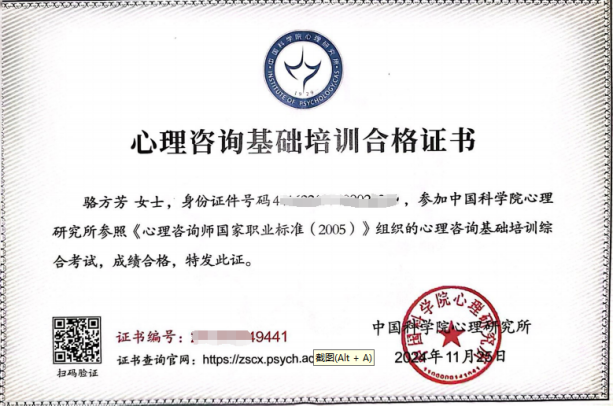 ▲心理咨询基础培训合格证书