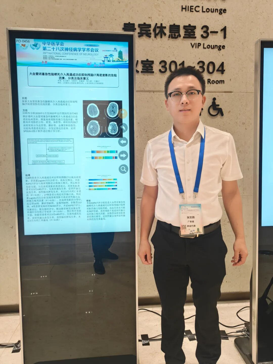 截至目前,他已作为项目负责人成功获批三项省医学科研基金,研究方向涵盖了介入再通后动脉溶栓的优化、大血管闭塞介入再通后无效再通和严重不良事件的预测等临床关键难题。其中,他与神经内科一区主任黄运强一起开展的关于“头部亚低温对介入术后患者预后影响”的前瞻性临床研究,初步结果显示该疗法能有效改善预后、降低死亡率,展现了巨大的临床转化潜力。同时,他与神经内科主任江震钦、医保科科长、神经内科主任医师钟小劲、神经内科二区主任朱敏真共同对介入术后即刻颅脑CT高密度影进行了创新性的分型(皮层型、磨砂型、金属型、弥漫型),并探索利用这些影像学特征来预测患者预后,指导个体化术后管理方案的制定。这些扎实的工作,让他从一名优秀的临床医生,逐步成长为一名具有独立科研思想的学者,并以第一作者发表了10余篇SCI论文。
