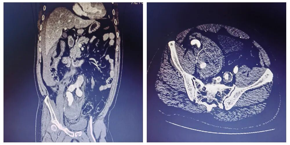 ▲主动脉CTA提示右侧髂内巨大动脉瘤破裂出血