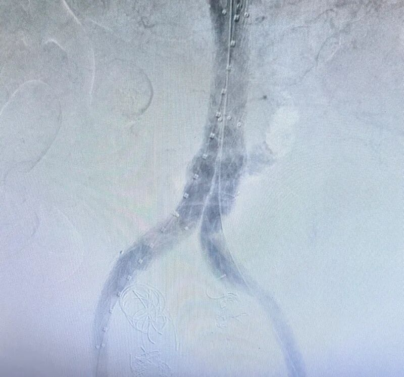 在紧张有序的筹备后,患者被迅速送入手术室。李立涛主任带领团队,凭借丰富的经验和娴熟的技术,为患者实施了“髂动脉瘤覆膜支架置入术+腹主动脉覆膜支架腔内隔绝术+髂动脉栓塞术”。手术通过股动脉穿刺点,在血管腔内精准定位、修复破口、隔绝瘤体,成功止住了致命性大出血。患者术中血压曾低至接近30mmHg,命悬一线,依赖手术团队快速的精准介入止血、麻醉医生的生命支持及护理人员的紧密配合,患者生命体征逐渐稳定。整个手术过程顺利,避免了传统开腹手术的巨大创伤,为后续康复奠定了坚实基础。