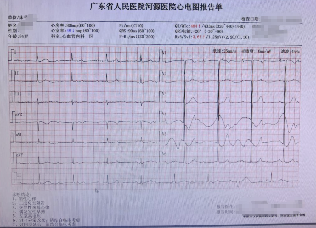 患者基本情况:女性,84岁,体重33kg。10余天前无明显诱因反复出现心悸,伴胸闷不适,来院就诊经检查诊断为:心律失常-Ⅲ°房室传导阻滞。
