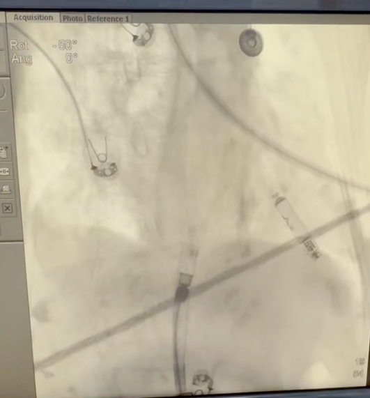 术中由于患者右侧疑似疝气,经过充足的准备,梁远红教授与张进鹏主任决定在局麻下行左股静脉穿刺,顺利地将无导线起搏器通过导管送入到患者的右心室,在室间隔标测到最佳固定位置后,将无导线起搏器一次旋入,有效避免了以往多次标测造成心肌损伤的问题。整个起搏器的植入过程仅耗费30分钟,患者均保持清醒状态,术中和术后,手术团队反复测试起搏器,参数均良好,无任何并发症,顺利完成手术。