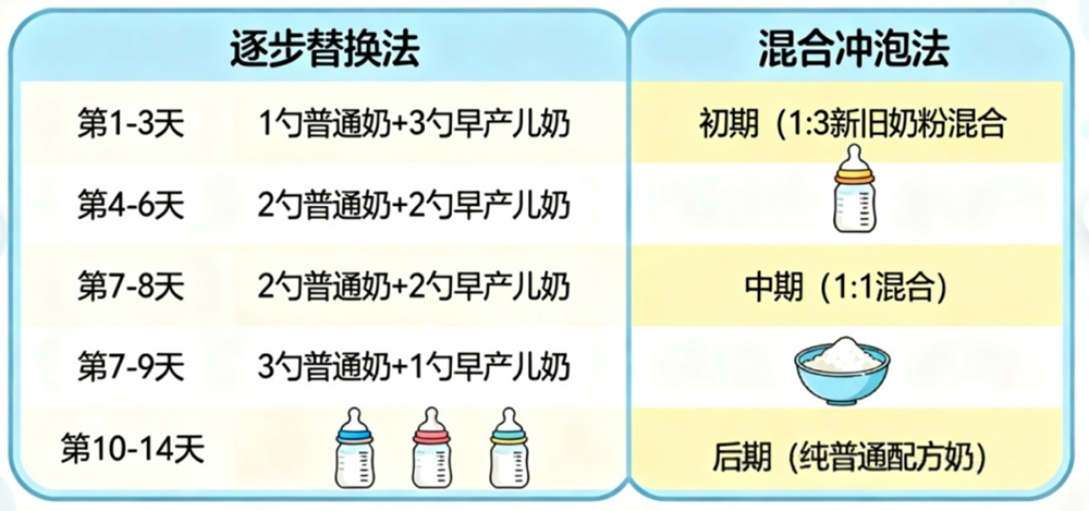1.逐步替换法:每次喂养时,用1勺普通配方奶替换原早产儿奶,其余仍用旧奶,持续3天观察宝宝反应;若排便、进食正常,再增加到2勺普通奶,依次提高比例,直到完全替换,全程建议1-2周,不急于求成。