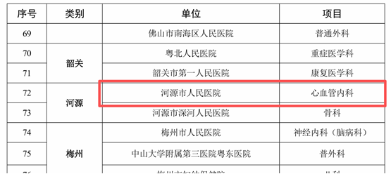 近日,广东省卫生健康委员会公布了2025年广东省省级临床重点专科建设项目名单,心血管内科凭借日益增强的心血管疾病诊治能力、持续改进的医疗服务质量与积极的创新发展,成功入选!这标志着我院心血管疾病诊疗能力、心血管学科建设水平和医院整体的区域医疗质量迈入了省级先进行列,是医院发展历程中的一座重要里程碑,更是为河源及周边地区百姓的健康提供更坚实保障的新起点。