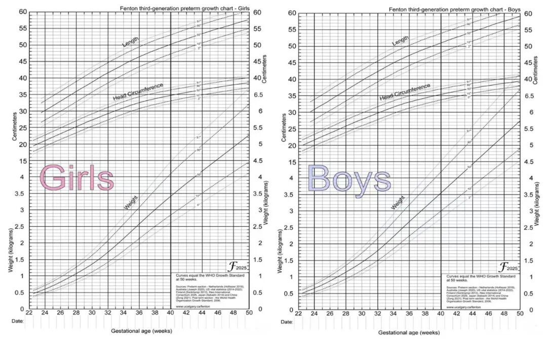 1.住院期间至矫正胎龄40周。此阶段应使用Fenton早产儿生长曲线。这张曲线图专门依据全球早产儿数据制定,能精确反映他们在类似孕周应有的生长轨迹。