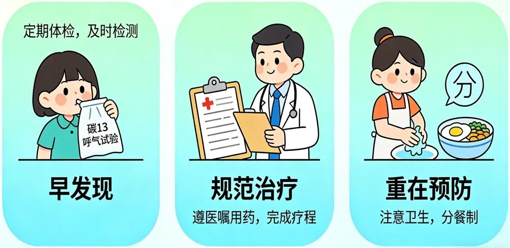 1.早发现:出现胃痛、胃胀、反酸、嗳气、口臭等症状时,应及时就医检查。常用检测方法包括碳13/碳14尿素呼气试验、胃镜检查等。