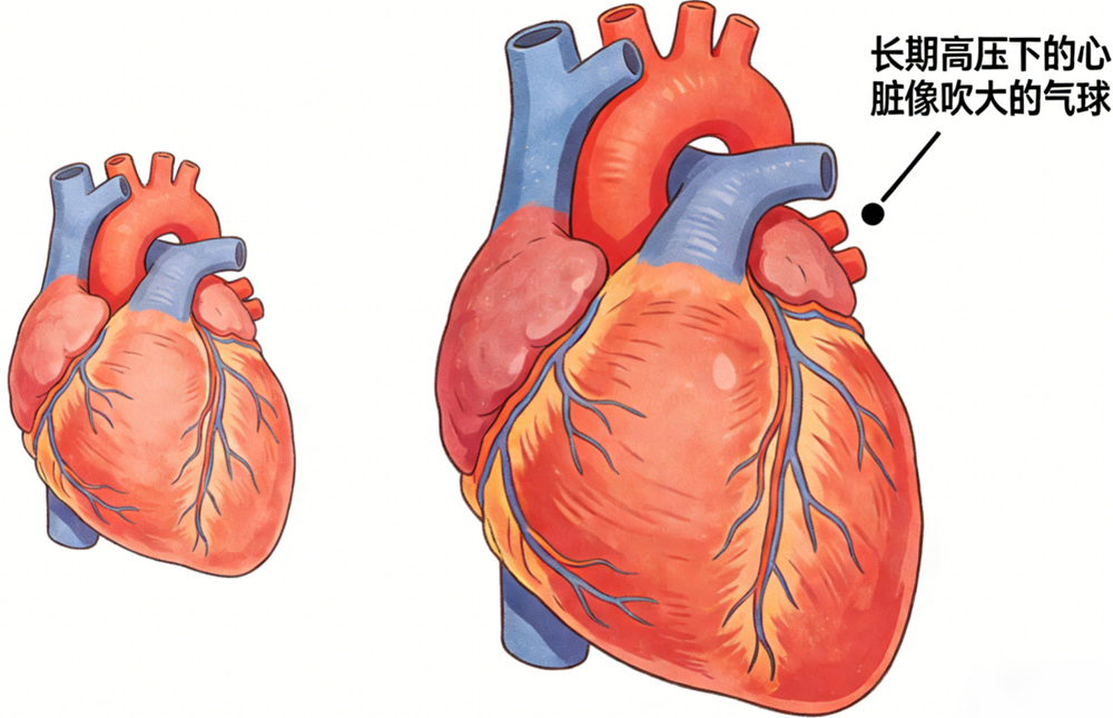 你的心脏是一台终身无休的“血液泵”。高血压意味着它每次收缩都要用更大力量对抗血管阻力。