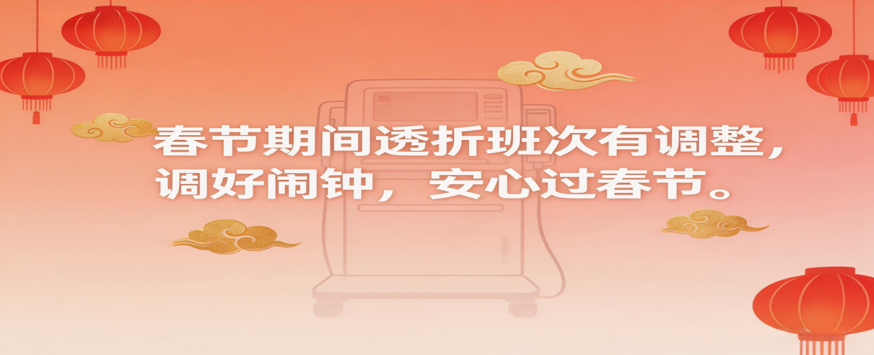 亲爱的肾友们,过年倒计时啦!这不仅是团圆的日子,更是透析肾友的“年关大考”。对于血液透析的肾友们来说,开心过年的同时,健康守护绝不能松懈!规律透析、合理饮食、呵护通路、规律作息,是平安过节的关键。血液净化中心为全体肾友送上“锦囊妙计”,简单实用、句句重点,陪大家健健康康、开开心心过大年!