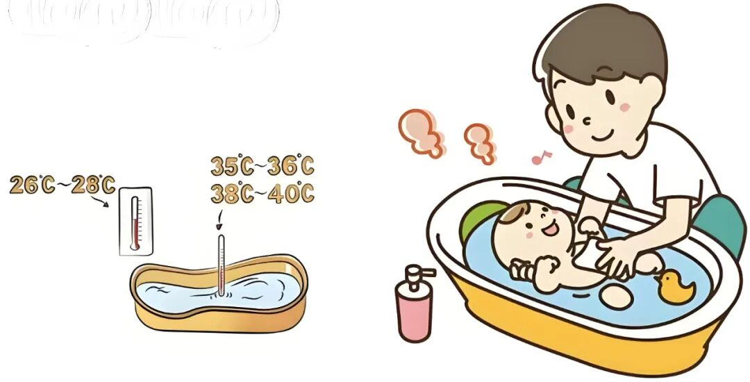 护士小贴士:和妈妈一起协作,您负责托住宝宝的头颈和屁股,稳稳放入水中;妈妈负责清洗。分工明确,其乐融融。