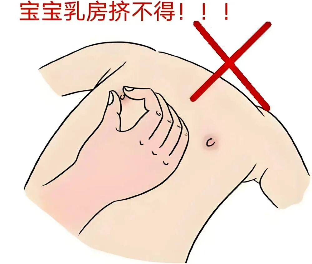 绝对不要挤压宝宝的乳房!有些长辈会说:“女宝宝要挤乳头,不然以后没奶水。”“男孩子要挤,不然乳房会肿大不退。”