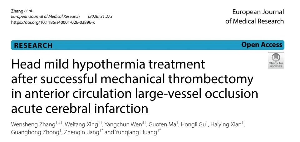 近日,神经内科在科研领域取得重要突破!由神经内科张文胜主治医师作为第一作者,神经内科负责人江震钦、神经内科一区主任黄运强作为通讯作者的原创性研究论文《前循环大血管闭塞急性脑梗死成功机械取栓后的头部亚低温治疗》,正式发表于国际SCI收录期刊European journal of Medical Research。这不仅标志着我院神经内科在脑血管病诊疗领域的临床研究能力迈上新台阶,也是医院“省医在河源”帮扶模式下科研育人成果的生动体现。