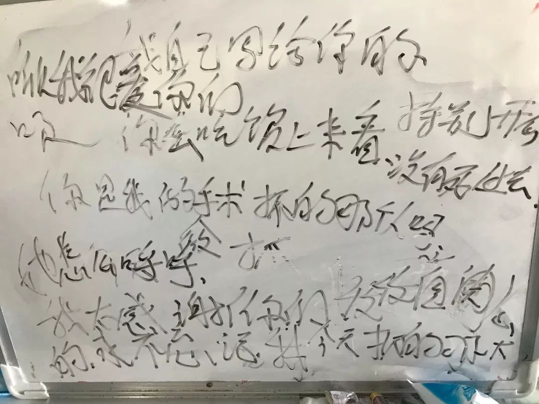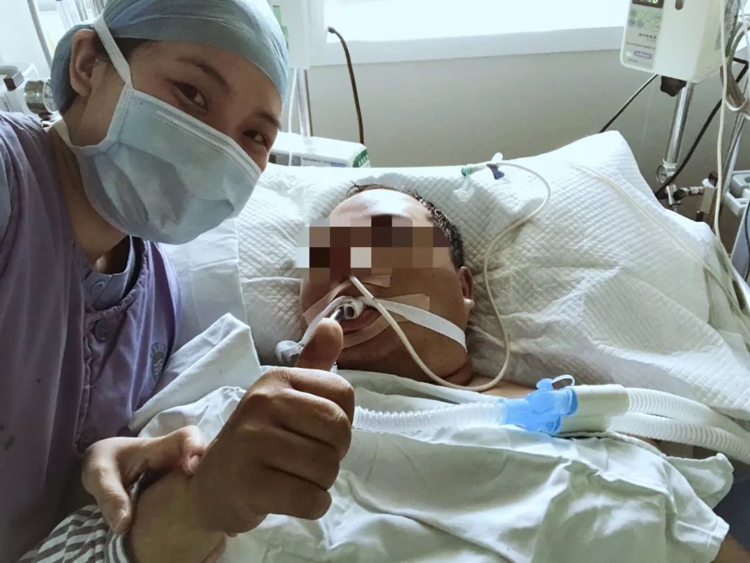 术后第二天,患者神志转清醒,管床护士向他告知了环境及他目前所处的状态,做了自我介绍,并向患者解释了所留置的气管插管,胃管,胸管,腹部引流管、尿管,深静脉管及管路的重要性。同时管床医生根据患者情况制定个体的镇静镇痛方案。在做好充分准备后,管床护士为患者解除约束,指导患者在床上自主更换体位,肢体功能锻炼,有需求用写字板写字与我们沟通,我们根据需要为他吸痰、吸口水,并协助他在床上完成生活自理。休息时播放音乐,缓解患者的焦虑与紧张。经过两天的治疗,患者顺利脱机,拔管,并安全转运至普通病房继续治疗。