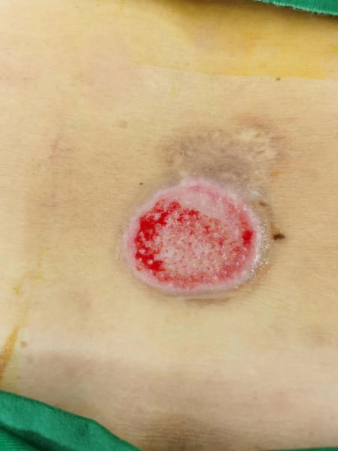 患者张某,女,60岁,因反复腰痛3年余,加重伴下肢麻痛跛行3天而入院,患者长期因腰椎间盘突出症反复发作而困扰,不时在当地诊所敷草药治疗,且皮肤因长期敷用草药致溃烂,遂就诊于我院。脊柱外科专家结合腰椎CT、MR、X线等相关检查结果,诊断为腰4/5椎间盘突出症。经保守治疗,效果欠佳。陈子华主任组织科室团队对病例进行讨论,患者具有手术指征。由于患者腰背部皮肤破损,若经后路切开椎间盘椎间融合有可能导致切口感染,经综合考虑后,决定对该患者实施微创椎间孔镜下椎间盘突出症摘除术。
